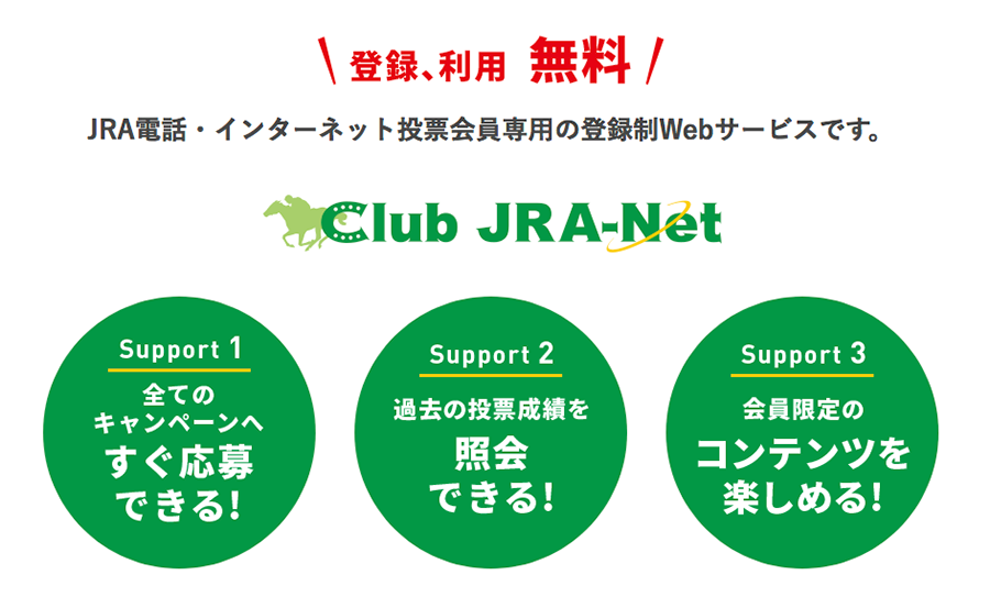 Club JRA-Netは登録料・年会費が無料のJRA電話・インターネット投票会員用Webサービスです。JRA電話・インターネット投票会員であれば、ご登録後どなたでもご利用いただけます。Club JRA-Netを初めてご利用いただく際は、専用サイトから「新規登録」を行ってください。