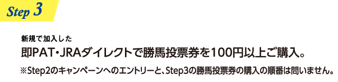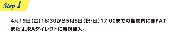 3.エントリー期間中に新規ご加入された「即PAT」又は「JRAダイレクト」を利用し、4月20日(土)~5月5日(祝・日)に開催されるJRAのレースを100円以上購入。