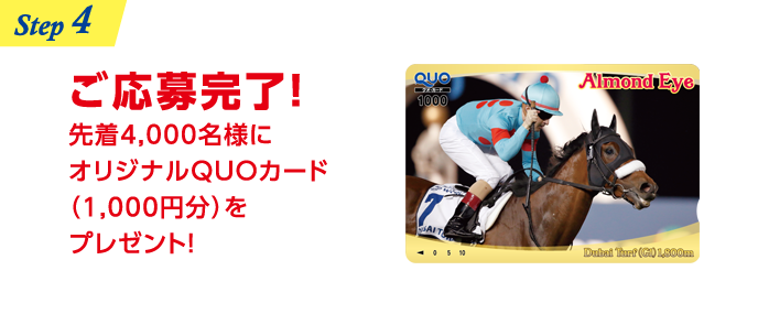 「即PAT」又は「JRAダイレクト」に新規ご加入いただき、以下の条件を満たすと、先着でオリジナルQUOカード(1,000円分)を4,000名様にプレゼントするキャンペーンです。
