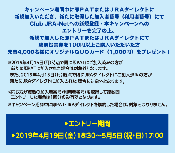 エントリー期間中に「即PAT」又は「JRAダイレクト」に新規でご加入いただいた方が対象となります。ただし、2019年4月15日(月)時点で既に即PATにご加入済みの方が新たに即PATに加入された場合は対象外となります。また、2019年4月15日(月)時点で既にJRAダイレクトにご加入済みの方が新たにJRAダイレクトに加入された場合も対象外となります。